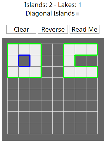 Finally, there is a MakeGrid object which uses the Grid and GridUX objects the draw a blank grid on the page. MakeGrid exposes functions clear, reverse and toggleDiagonal which are called in response to clicking the Clear button, Reverse button, and Diagonal Islands respectively. Each of these functions is a closure. That is, they close over the Grid & GridUX objects. As a result, both Grid & GridUX are available to the click events without being in the global scope.